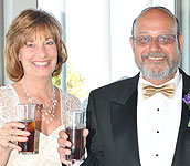 In November, we went out to dinner with ten of Harry’s friends. Two of his friends walked into the restaurant carrying an eight-foot sign that said, “Laurie, will you marry me?” Love, Harry. We became engaged and left on a cruise the next morning.